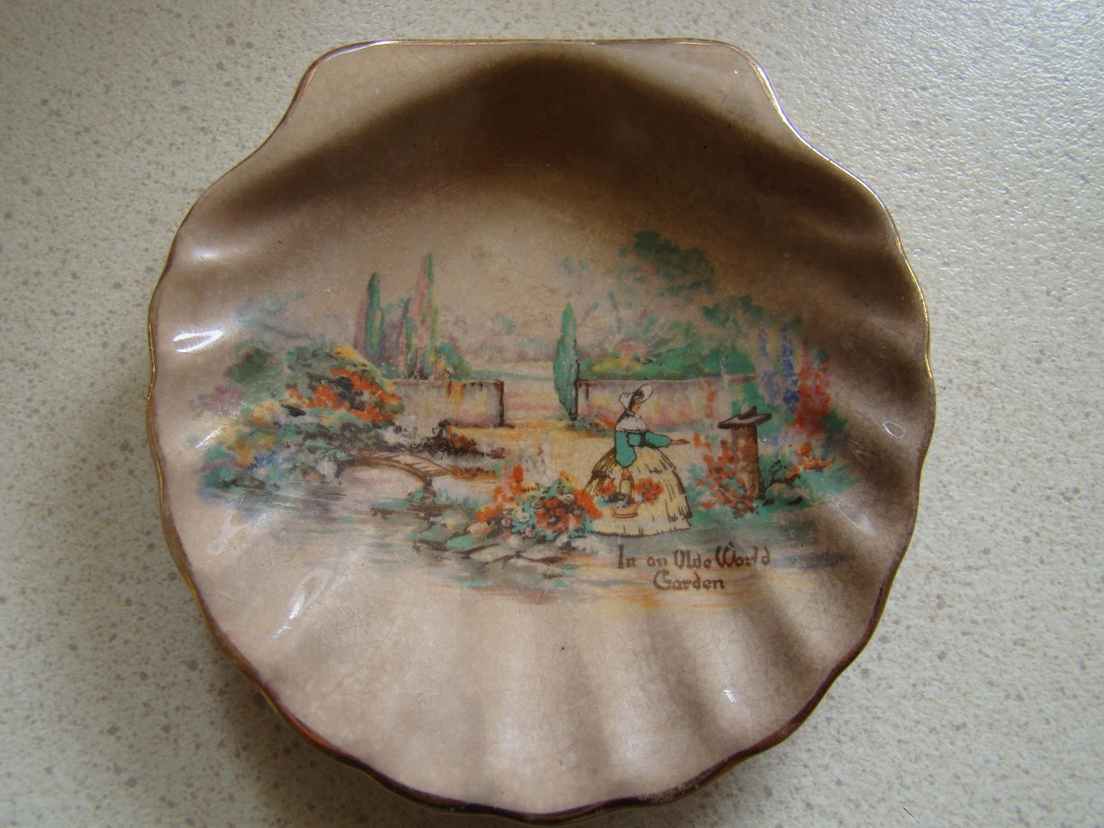 My little treasure is a small shell shaped plate about 7 centimetres wide with a hand painted picture of a lady walking near a bridge in a garden. In an olde world garden is written on it. How quaint. Finding this is a vintage treasure has been quite a surprise. I will not be putting used tea bags on it anymore.
